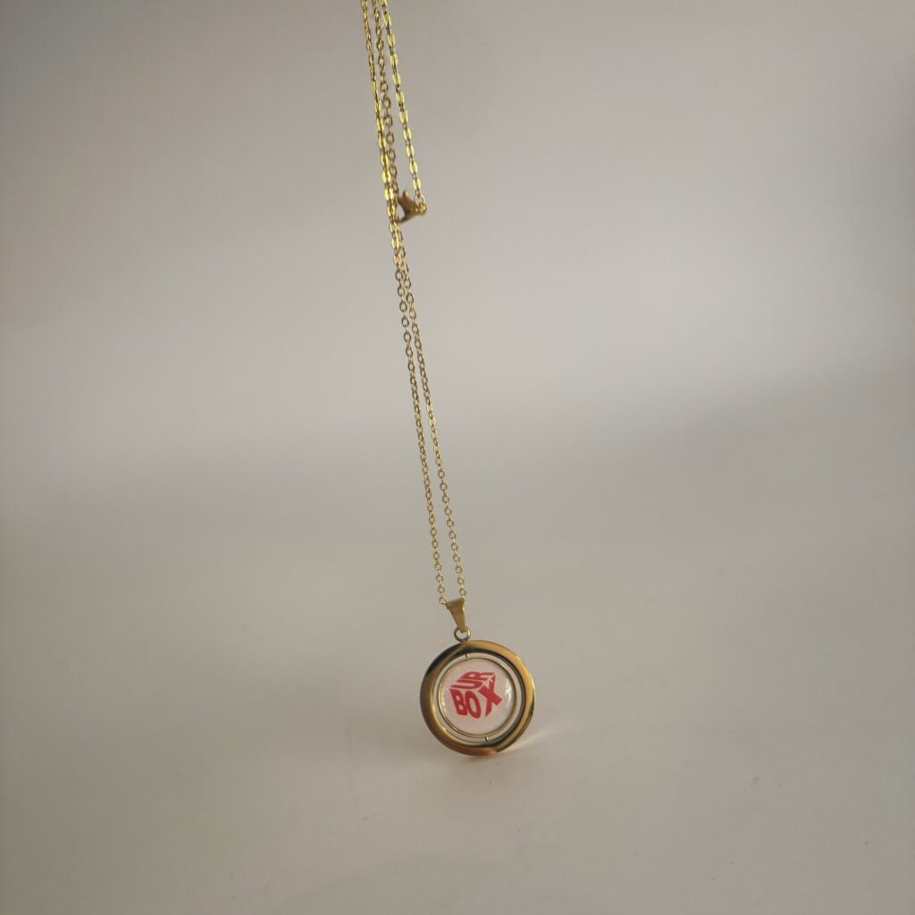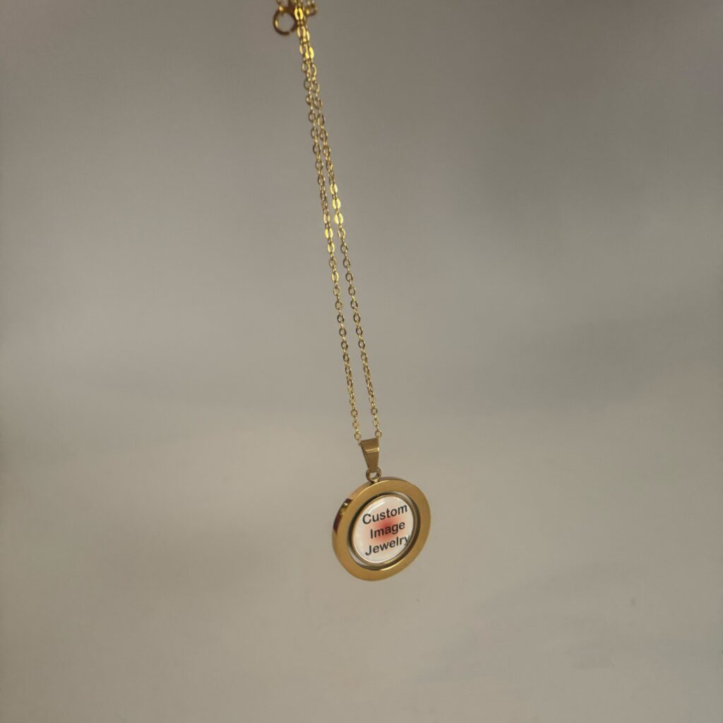 “Customizable double-sided pendant – insert your own photo or logo on both front and back.”