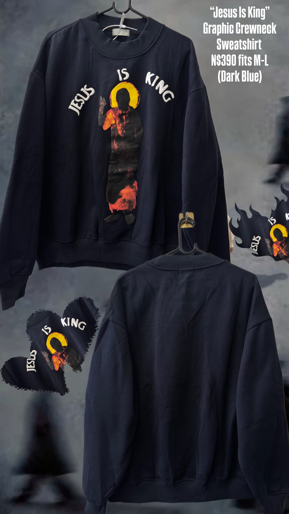 “Jesus Is King” Graphic Crewneck Sweatshirt N$390 fits M-L (Dark Blue)